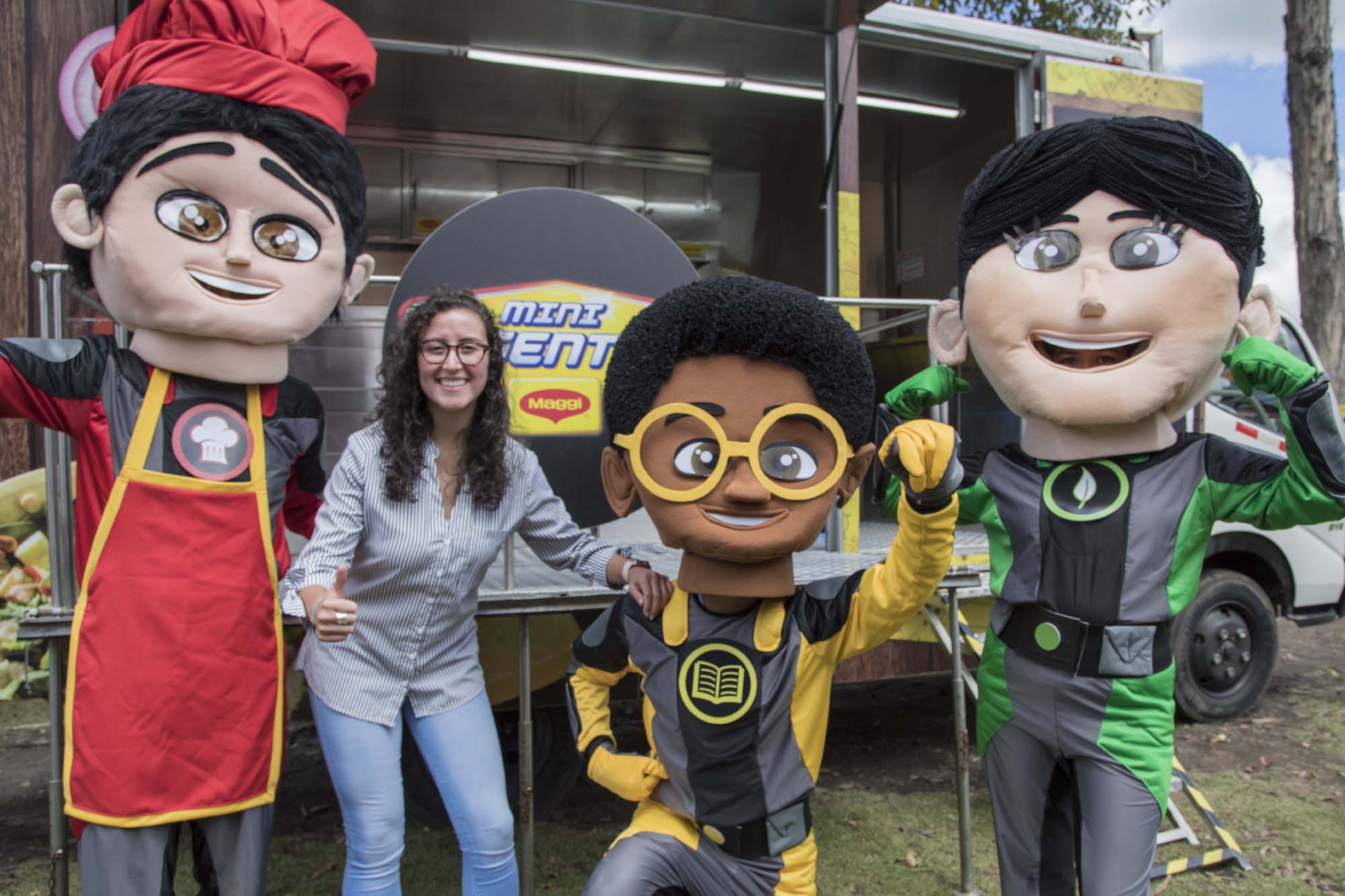 En la fotografía de izquierda a derecha: Valeria Zárate, Especialista de Marketing para el Negocio de Culinarios de Nestlé Ecuador, junto a los personajes de Mini Agentes Maggi:Luca, Leo y Flor.