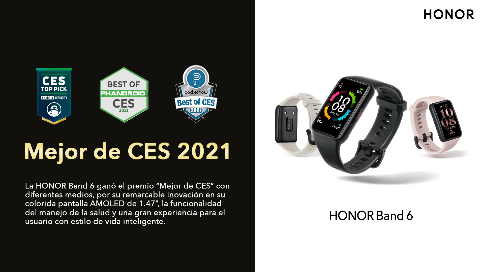 Bajo el propósito de brindar productos premium capaces de fortalecer y motivar a la gente, Honor presenta en el mercado ecuatoriano la nueva Band 6, ganadora del premio “Mejor de CES”, gracias a su remarcable innovación; el reloj inteligente cuenta con una moderna pantalla AMOLED de 1.47 pulgadas, que posibilita monitorear funciones de ejercicio y salud, tiene una batería de larga duración (24 horas) lo que permite una fusión perfecta entre la innovación y la elegancia tecnológica.