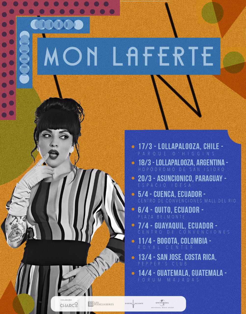 La cantante chilena Mon Laferte confirmó las fechas de su primer recorrido del 2018. A sus ya anunciadas presentaciones en Lollapalooza Chile y Argentina (sábado 17 y domingo 18 de marzo) y su actuación en el festival Asunciónico de Paraguay (martes 20 de marzo), ahora sumó shows en Ecuador (5, 6 y 7 de abril); el miércoles 11 de abril volverá a Bogotá, Colombia y luego debutará en Centroamérica con actuaciones en Costa Rica y Guatemala (13 y 14 de abril).