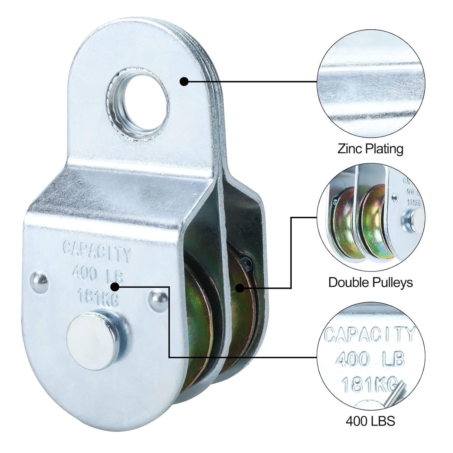 Specifications ▪ Name : Pulley ▪ Type : Double Pulley ▪ Material : Iron and Zinc plating ▪ Safe Working Load : 181kg/ 400lb ▪ Maximum Rope Diameter : 1/2" Features ▪ Electro-Galvanized treatment can improve the corrosion resistance of the surface. ▪ Bright and beautiful appearance. ▪ The pulley realizes the simple insertion of wire rope and chain which avoids the trouble caused by threading. Applications ▪ Helps you lift or pull heavier things into place, allowing you to be safer. ▪ Designed for indoor or outdoor applications with ropes or chains. ▪ Suitable wire diameter 1/2 inch or less. ▪ For light duty such as hunting, workshop, garage work, and more. Note ▪ Do not exceed the safe working load when using, not for overhead lifting ▪ Manual measurement, error 1-3mm, depending on the actual situation, please understand. ▪ Please feel free to contact us if you encounter any problem about the pulley. You could get a quick response once contacting.