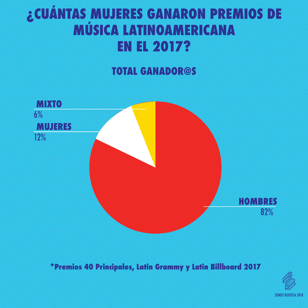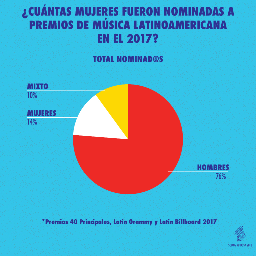 De más de 500 nominaciones analizadas de los premios Latin Grammy, Latin Billboards y Los Premios 40 Principales del 2017, hubieron sólo 68 nominadas y apenas 14 ganadoras de 117. Lo que sí: los números muestran que a la hora de ser nominadas, las mujeres son premiadas casi la misma cantidad de veces que sus contrapartes masculinos.