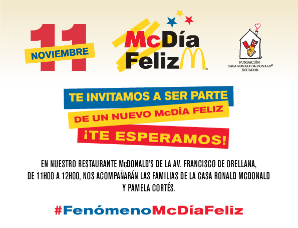 Guayaquil, noviembre 10.- La jornada solidaria McDía Feliz llega a todos los McDonald’s de Ecuador, para recaudar fondos y colaborar con la Fundación Casa Ronald McDonald. Importantes personalidades, funcionarios y los empleados de los locales se unirán a la nueva campaña solidaria, que incluirá la venta de Big Mac.